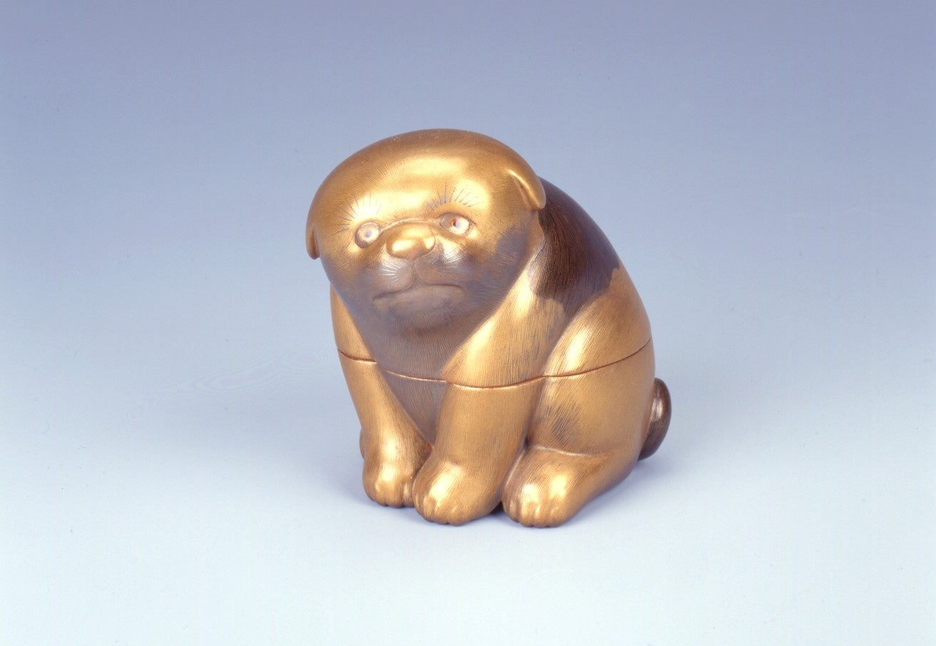 蒔絵の技法が用いられる漆工品。毛描きがなされ、ずんぐりとした身体の小犬が愛らしく坐るも、目には悲哀がこもる。旧所蔵者のカザール氏は香合として蒐集したが、ボンボニエールのような小物入れとして機能した可能性がある。