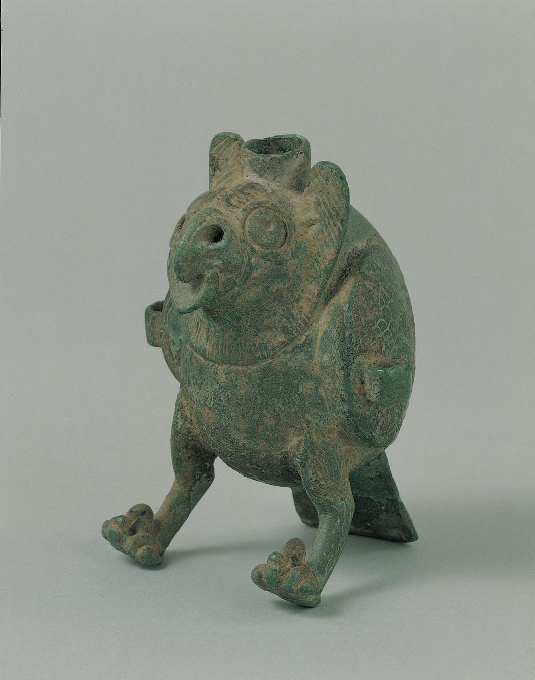 鋳造によって制作された古代中国の金属器。フクロウの類の鳥をモデルとしている。顔、目鼻立ちが大きく、ユーモラスな表情をするが、フクロウは古(いにしえ)の中国では霊鳥の一種と捉えられた。頭上の穴にスポイト状の滴管を挿入して用いられた。
