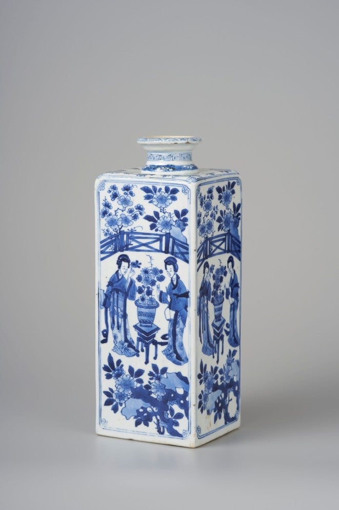青花 婦人図方瓶(せいかふじんずほうへい) 景徳鎮窯(けいとくちんよう) 中国・清時代・17世紀 大阪市立美術館蔵