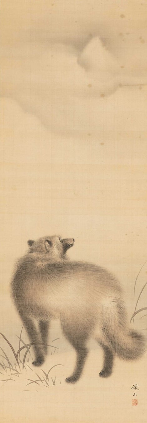 大阪の代表的豪商・加島屋久右衛門家に伝来した。森徹山は、森狙仙の甥にあたり、円山応挙門下の十哲に数えられる。森派特有の柔らかな毛描きが認められ、静寂な空間で、ふと月を見上げる狸が描写される。