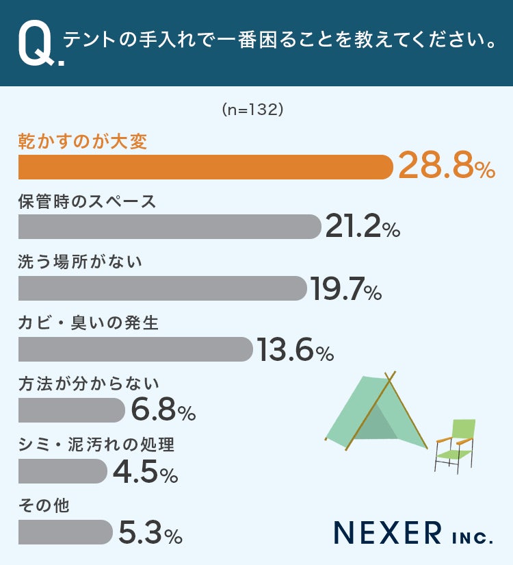 続いて、テントのお手入れで一番困ることを聞いてみました。