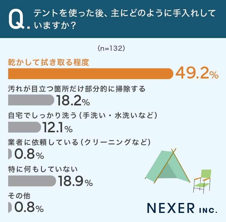 ■テントの手入れ、49.2%が「乾かして拭き取る程度」の簡単なお手入れと回答