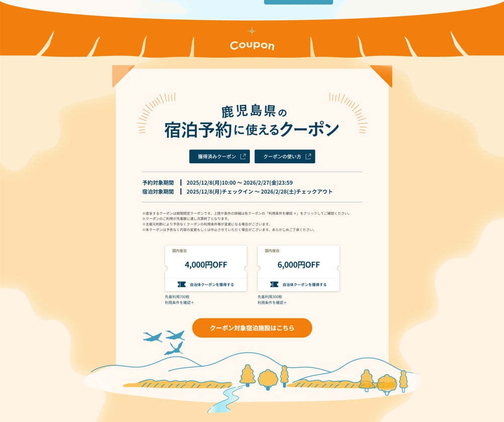 楽天トラベルページ内に開設する特設ページでは「温泉」「グルメ」「イルミネーション」「体験・アート」「自然」のカテゴリで約30スポットを紹介。また、ページ内にて⿅児島県内の宿泊施設で利⽤可能な割引クーポンを配布することで、観光客の来訪を直接的に後押しします。