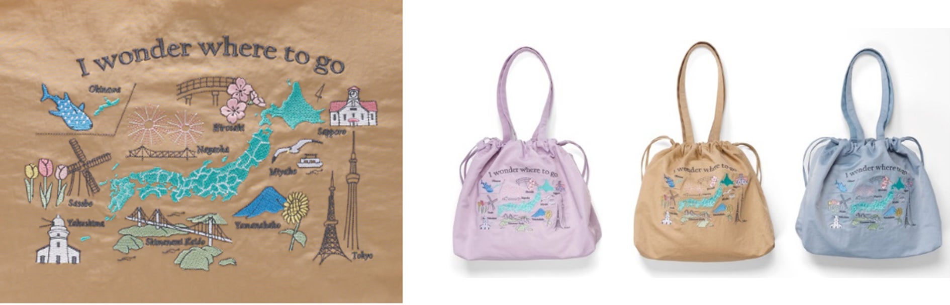 ドローストリングバッグは、日本列島のイラストマップに10エリアの観光スポットの魅力を繊細な刺繍で表現しています。眺めていると思わず旅に出たくなるデザインです。色はラベンダー、ベージュ、ブルーの3色展開。ドローストリングバッグを含む総額約11,000(税込)相当の地図柄アイテムが入っています。
