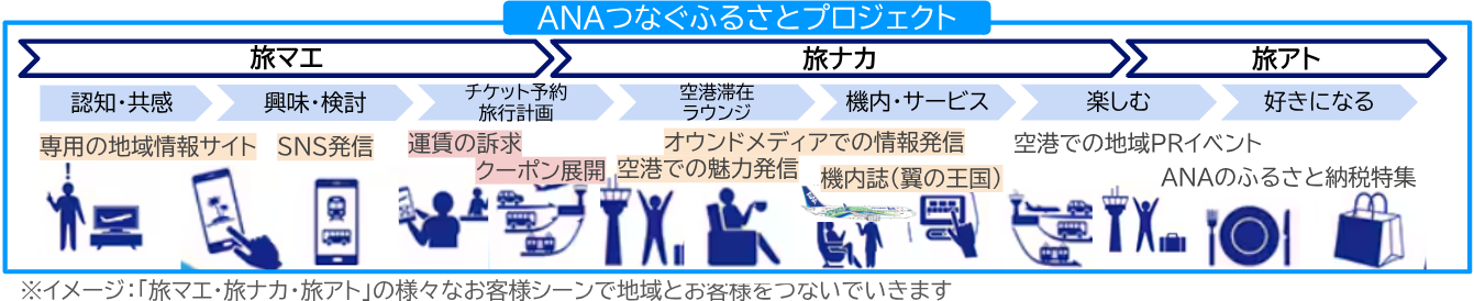 地域創生の新たな取り組みとして「ANAつなぐふるさとプロジェクト」を始動します。プロジェクトのコンセプトは、「ふるさとをつなぐ」。ANAの地域創生トータルパッケージとして、お客様の「旅マエ・旅ナカ・旅アト」という全ての プロセスで地域の魅力を発信・体験していただき、人流の拡大に貢献していきます。