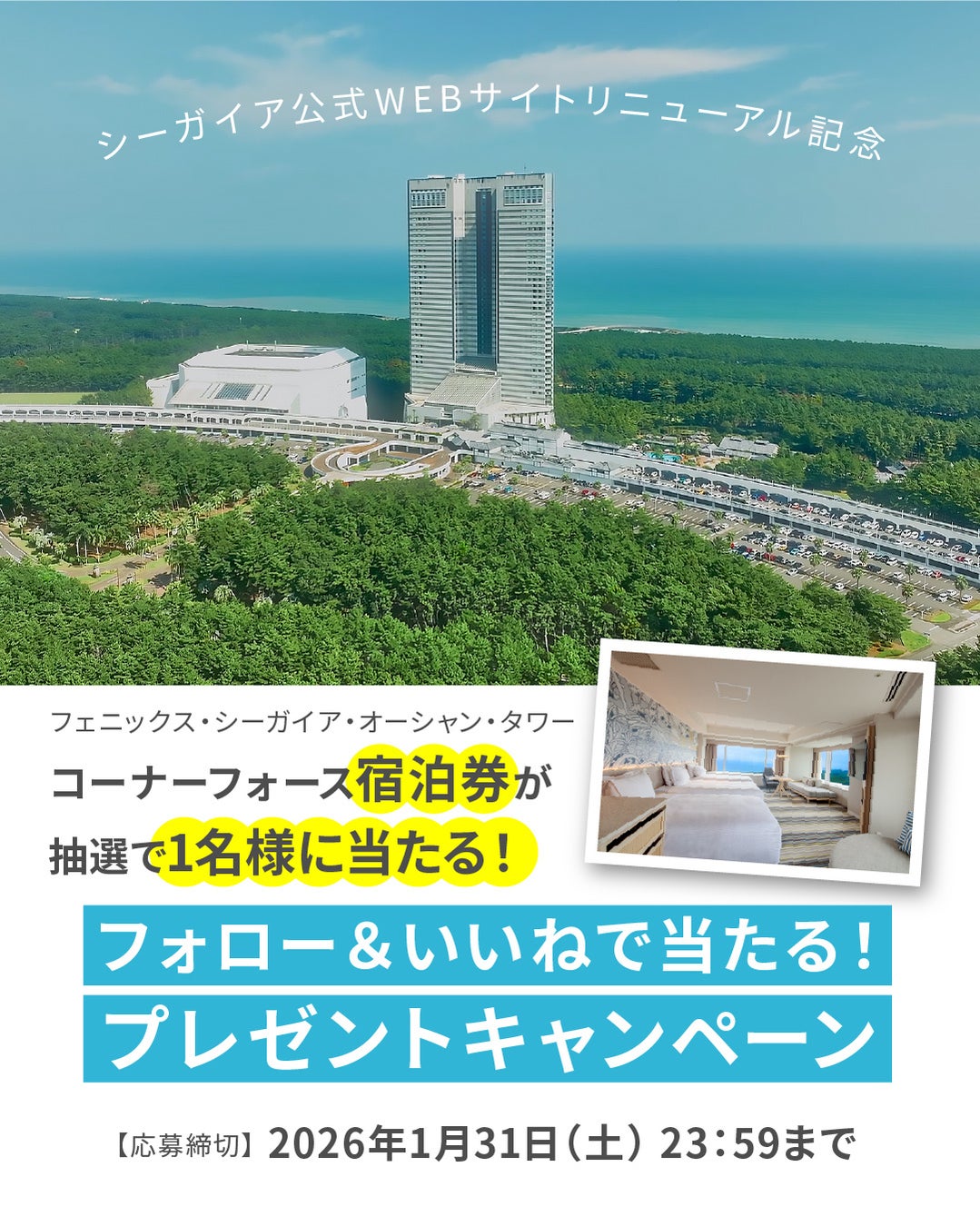 公式WEBサイトリニューアルを記念して、シーガイア公式Instagramにて「フェニックス・シーガイア・オーシャン・タワー」宿泊券が当たるキャンペーンを実施いたします。詳細は公式Instagramをご確認ください。