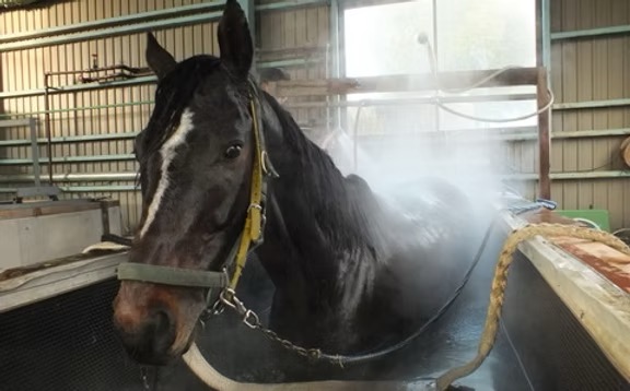 栗東からも近い滋賀県東近江市の自然に恵まれた場所にある、馬のトレーニングとリフレッシュのための施設。施設内にはダートトラックや馬場、ウォーキングマシンのほか、馬用温泉があるのが特徴。泉質はアルカリ成分含有の単純温泉で、疲労回復、神経痛、筋肉痛、皮膚病などに効果があるといいます。