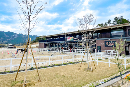 比叡山のふもと、伊香立(いかだち)に位置する乗馬クラブ「ラクエドラゴン ホースパーク」。このクラブは関西最大級の敷地面積を誇り、約80頭の馬を飼育しています。クラブハウスの2階には、誰でも利用できるカフェ「バグース」があり、テラス席からは棚田の穏やかな風景と、馬場をのんびり走る馬たちを眺められます。また、パーク内では、放牧中のミニチュアホースとふれあうことも可能です。
