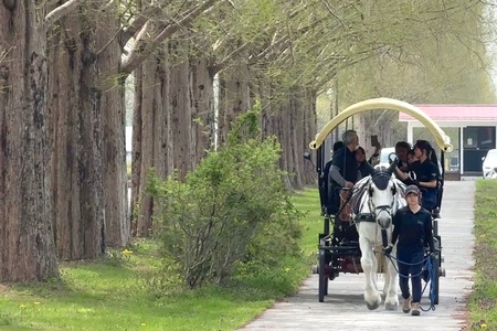 滋賀有数の観光地・メタセコイア並木のすぐそばに、2025年、観光養老牧場「メタセコイアと馬の森」がオープン。ロマンティックな雰囲気の並木沿いにて、馬さんぽ(乗馬)や並木馬車が楽しめます。敷地内では引退競走馬のサラブレッドやミニチュアホースなどがのんびりと過ごし、厩舎見学や餌やりなどのふれあいも可能。馬を眺めながら、ほっとひと息つけるカフェもあります。
