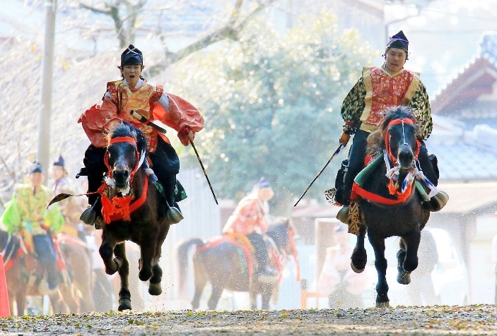 毎年11月第2日曜日に行われる神事。古来の衣装をまとい木曽馬などの日本在来馬に乗って、競べ馬(くらべうま)や流鏑馬(やぶさめ)など人馬一体の演武が神様に奉納されます。