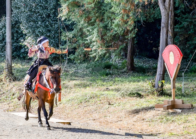 引き馬で馬の背に乗り、弓を引いて的を射る流鏑馬を体験できます。参加は小学生以上となります。