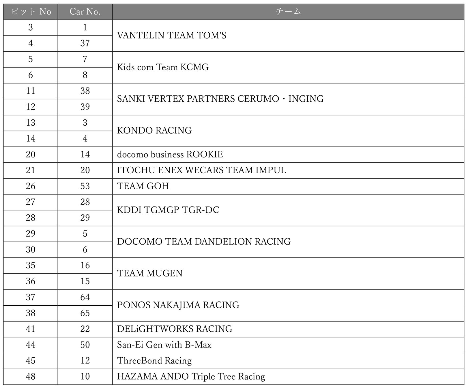 SUPER FORMULA 合同テスト・ルーキーテスト ピット割り