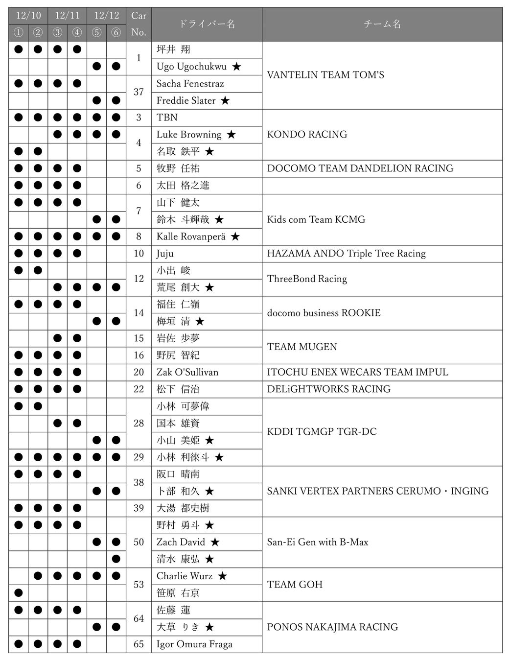 ※ ★印はルーキードライバーとなります。