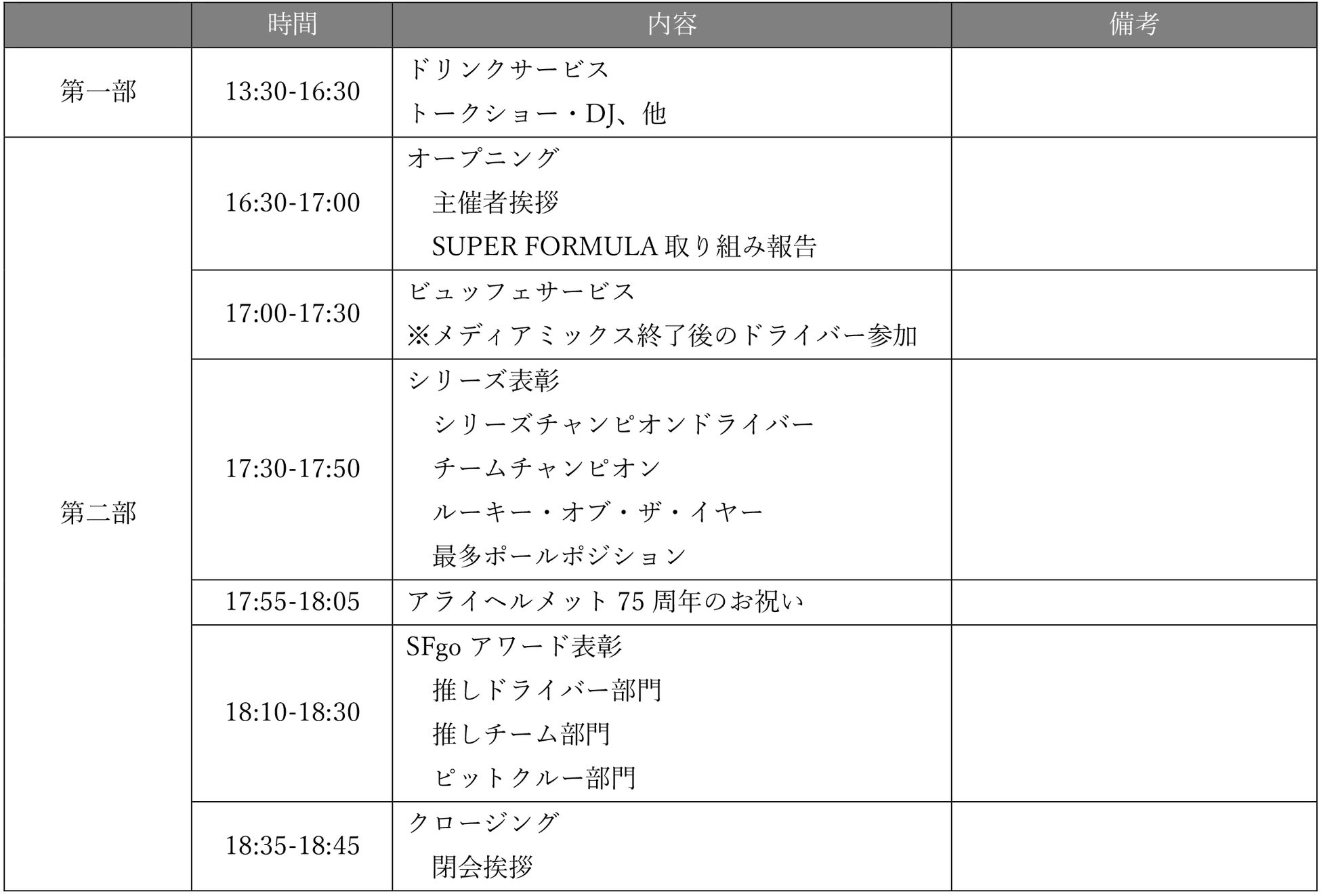 SUPER FORMULA AWARDS ‒ Partner Thanks Day タイムスケジュール