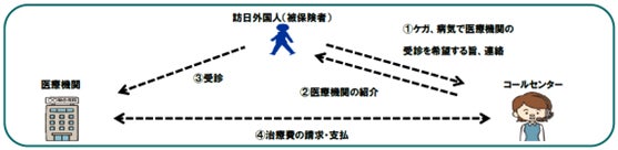 ご利用方法:①医療機関での治療を希望する場合、コールセンターへ訪日外国人(被保険者)の方
