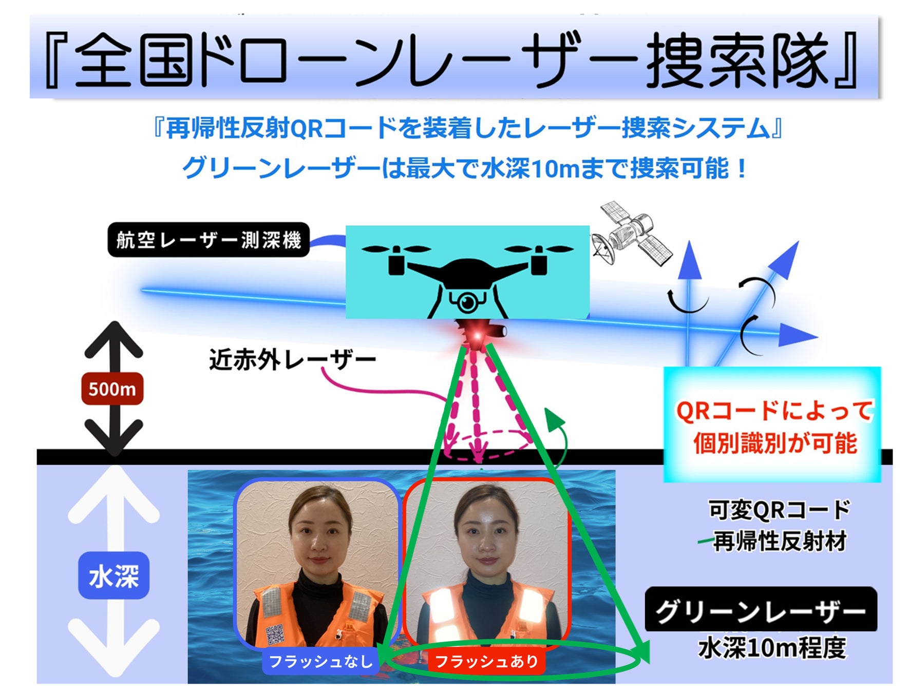 【NPO法人光探索協会】(大阪市、理事長:前田佳伸)は、東日本幹事企業のAPEX株式会社(東京都、代表:下戸優輔)および西日本幹事企業のSMGコンサルタント株式会社(山口市、代表:岡村文義)と協同して「全国ドローンレーザー捜索隊」を組織し、グリーンレーザー捜索を開始します。海中は電波が透過しませんので、目視による捜索しか有効な手段がありません。しかし、大津波などの災害直後はヘリコプターなどの手配が限られます。無人のドローンであれば二次遭難の危険性がないので、ドローンレーザー捜索は有効な捜索手段になります。そのために大津波などの災害に備えて、平時から「再帰性反射可変QRコード」を人やペットのウェアに装着して、レーザー捜索によって人命救助できる体制を構築する運動を展開します。