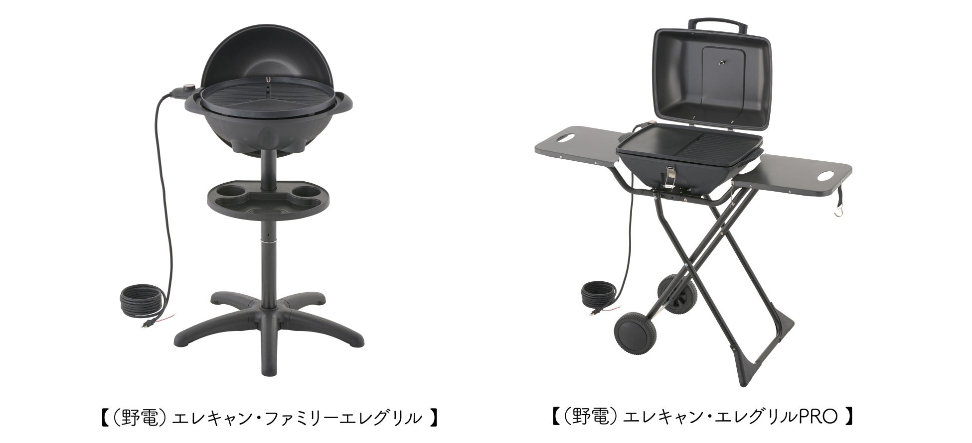 コンセントに挿してスイッチを押すだけで手軽にBBQができる電気式グリル「(野電)エレキャン・エレグリル」2種を、様々なアウトドアシーンやご家庭でのBBQに、ぜひともご活用ください。