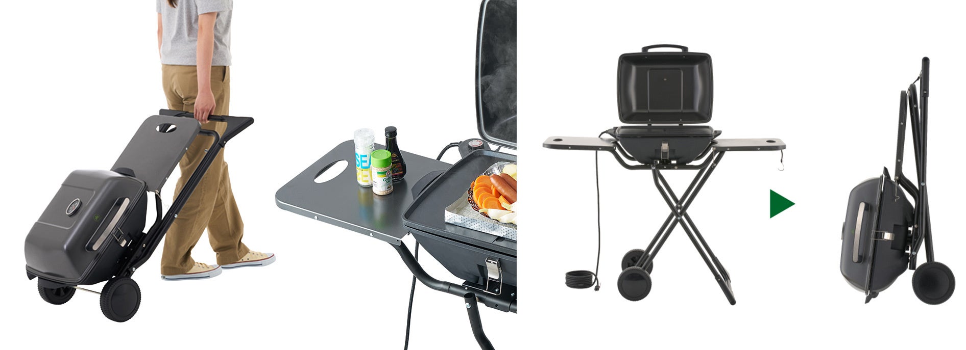 「エレグリルPRO」は、便利なキャスター付きで、野外に持ち出す際の負担を軽減し手軽に移動できる。プレートの両サイドには、調味料や食材が置けるテーブル付き。さらに、折り畳んでコンパクトに収納できるので、収納場所にも困らない。