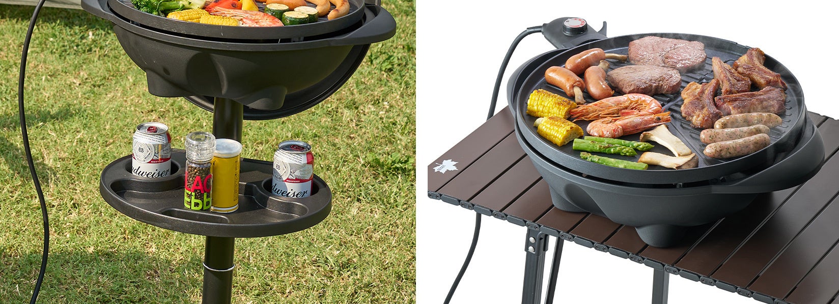 「ファミリーエレグリル」は、調味料や飲み物が置けるカップホルダー付き。グリルプレート部分をスタンドから取り外すと、卓上でもBBQを楽しむことができる。