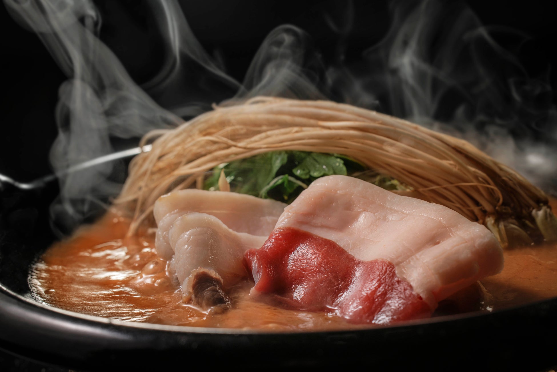 冬から春にかけて最も美味しさを増す、厳選した猪肉を、合味噌で煮込む仕立てです。秋には冬眠に備えて木の実を食べ、冬には繁殖期を迎える猪は、この時期にさらに脂がのることで、甘味が増します。猪肉と相性のよい牛蒡や白葱、クレソンやセリが、猪肉本来の力強い味わいを引き立てます。