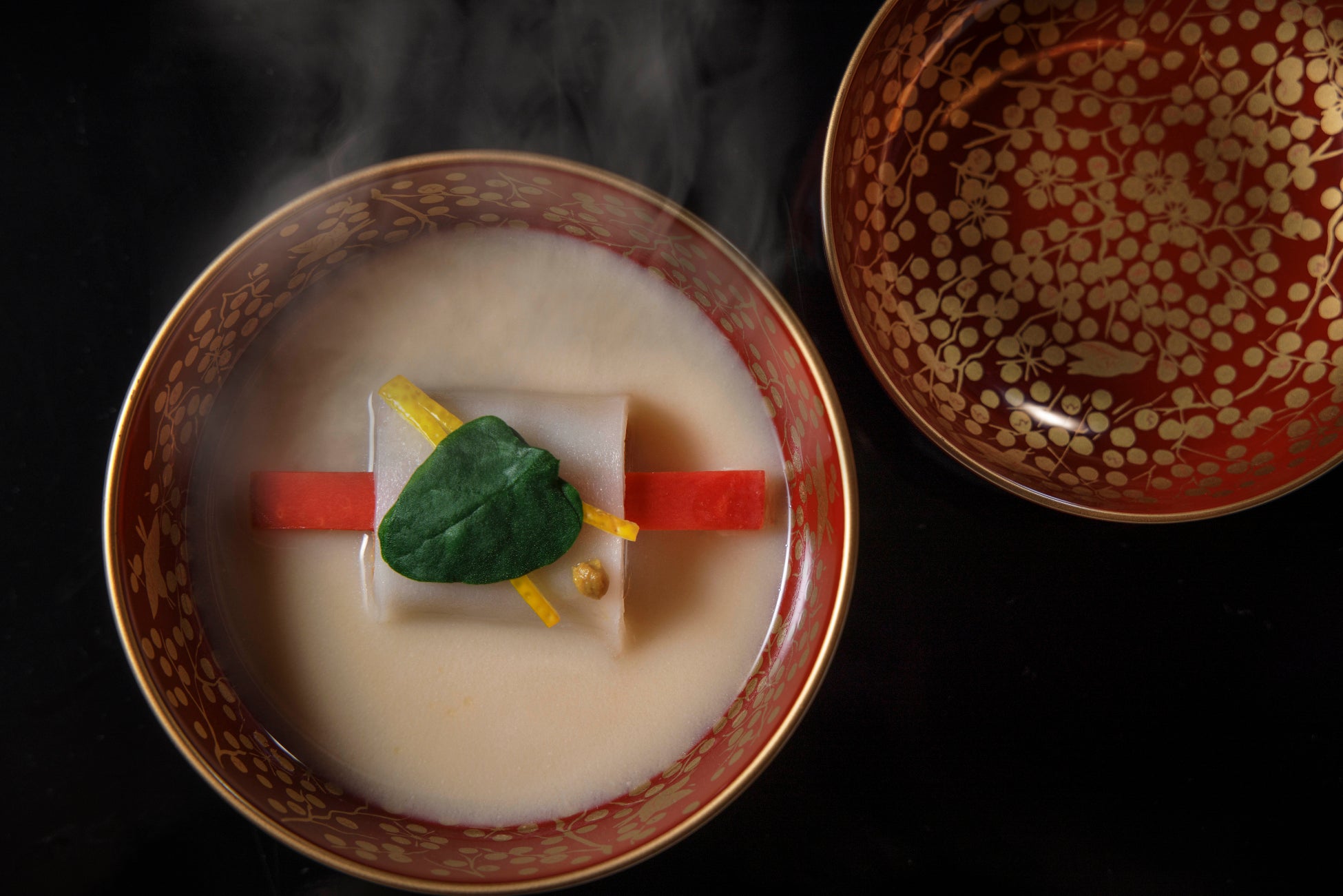 鹿肉に大和芋を混ぜ合わせ、じっくりと蒸し上げることで、驚くほどやわらかく、ふんわりと仕上げた鹿真丈のお椀です。白味噌の優しい甘みや柚子の香り、ほくほくとした海老芋の食感が、鹿肉の旨味をさらに引き立てます。