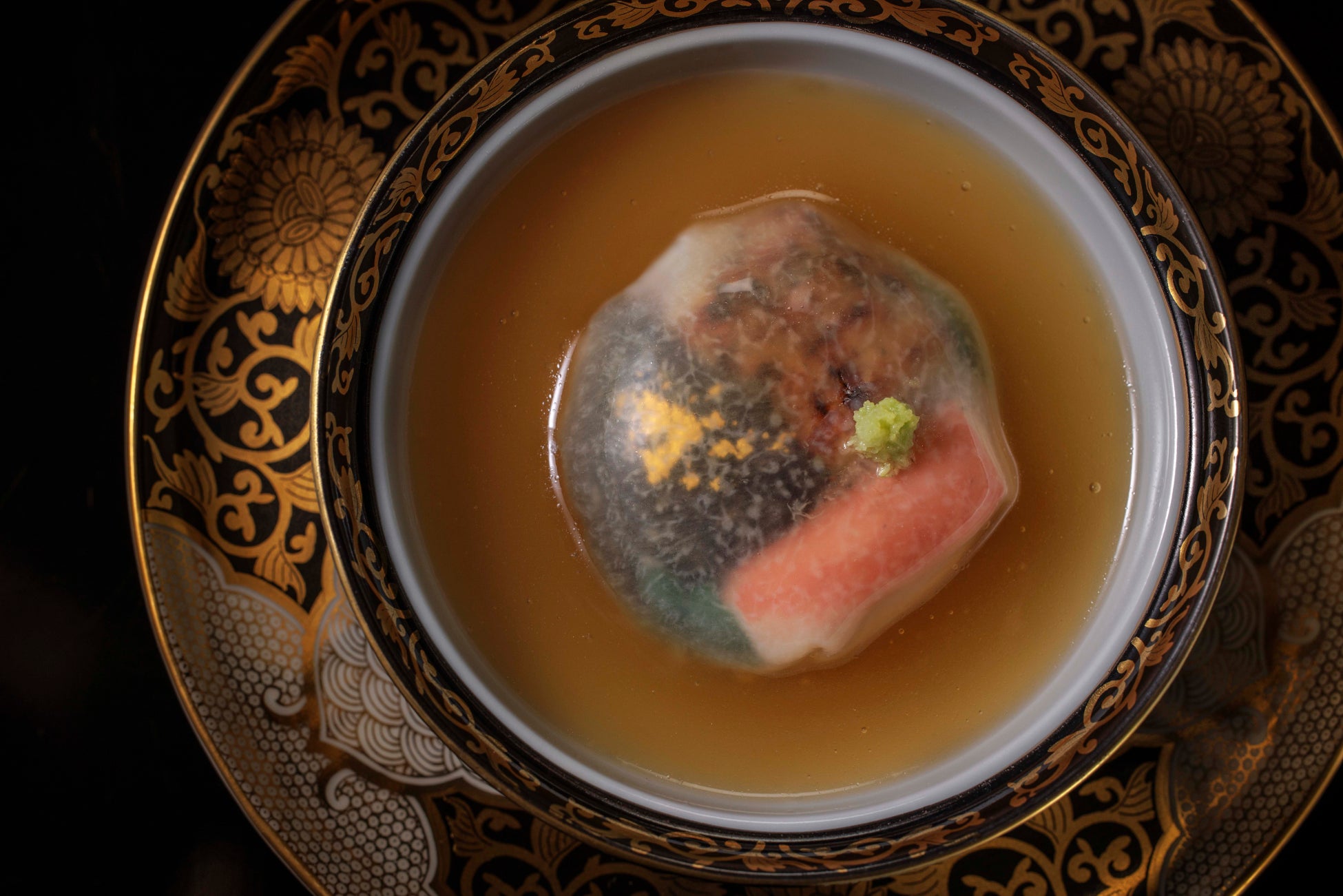 この時期、旬を迎える山・川・海の幸を、薄氷に見立てた蕪で包んだ進肴です。川からは脂の乗った冬鰻、海からは甘みが凝縮した蟹を。そこに香り高いあわび茸など山の恵みが加わり、絶妙な調和を奏でます。仕上げにたっぷりとかける、燻製きのこ出汁の豊かな香りが、食欲をそそります。