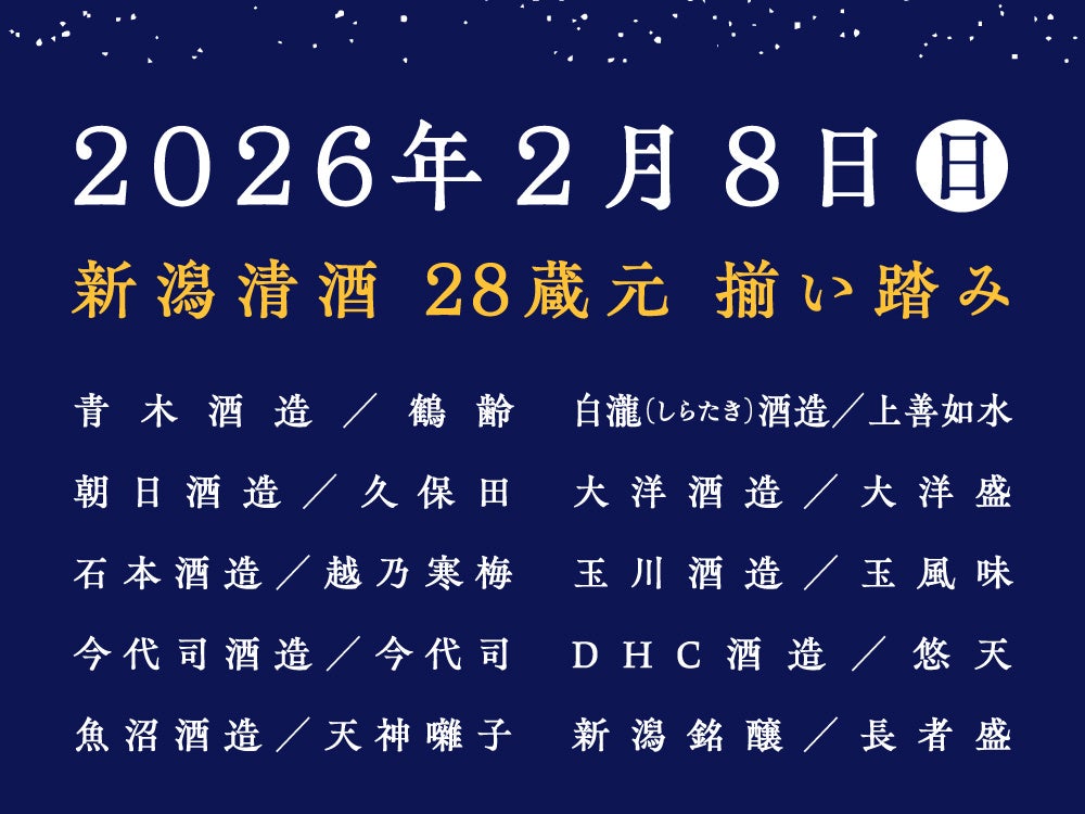 ANAクラウンプラザホテル新潟(新潟市中央区/総支配人 松宮 郷)・新潟市(市長 中原 八一)では、「新潟清酒・28蔵元」が集結する、試飲&グルメイベント「2026 冬酒まつり」を、2026年2月8日(日)、ANAクラウンプラザホテル新潟にて開催いたします。