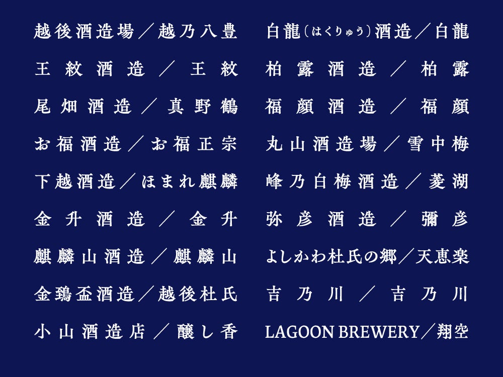 青木酒造/朝日酒造/石本酒造/今代司酒造/魚沼酒造/越後酒造場/王紋酒造/尾畑酒造/お福酒造/下越酒造/金升酒造/麒麟山酒造/金鵄盃酒造/小山酒造店/白瀧(しらたき)酒造/大洋酒造/玉川酒造/DHC酒造/新潟銘醸/白龍(はくりゅう)酒造/柏露酒造/福顔酒造/丸山酒造場/峰乃白梅酒造/弥彦酒造/よしかわ杜氏の郷/吉乃川/LAGOON BREWERY