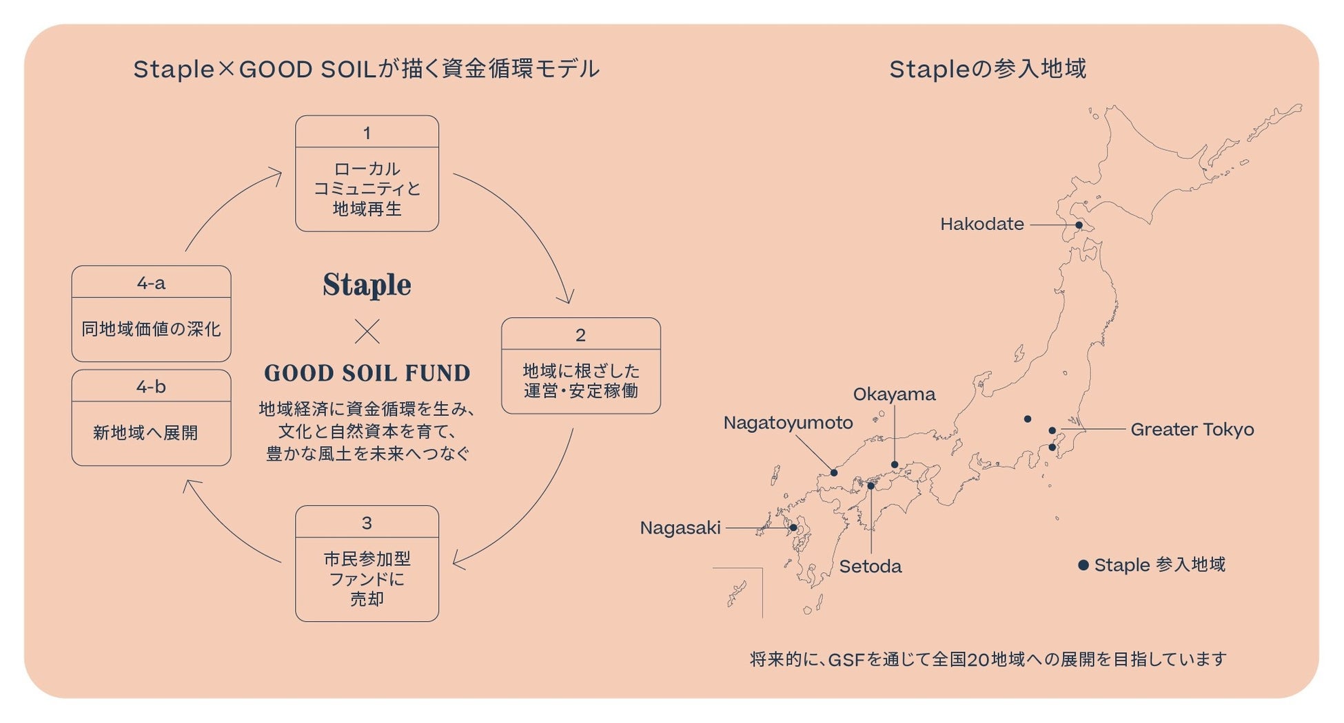 GOOD SOILのグループ会社である株式会社Staple(以下「Staple」)では、これまで上記図に記載の地域に参入しており、今後も参入地域を全国各地に広げていく予定です。こうしたStapleの取り組みを背景に、GOOD SOILでは、Stapleが既に参入している地域の更なる価値向上に貢献するホテル開発への投資と新たな地域展開に向けたホテル開発への投資の双方を検討し、地域住民・関係人口・リピーターとともに、資金・人・文化が巡る地域の未来を共創していきます。