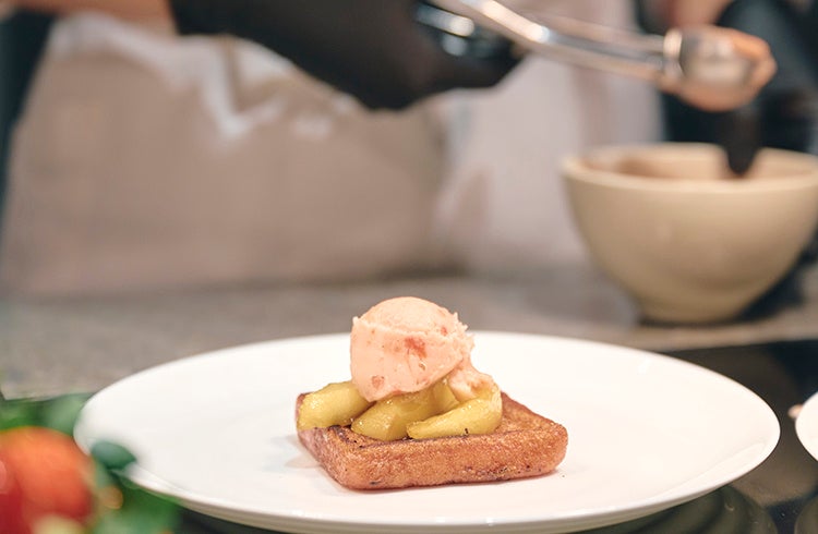 ふんわりと焼き上げたフレンチトースト。芳醇な香りをまとったアップルフランベと、爽やかなストロベリーソルベを添えてお召し上がりください。