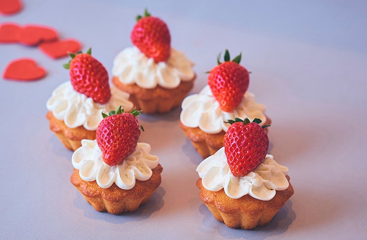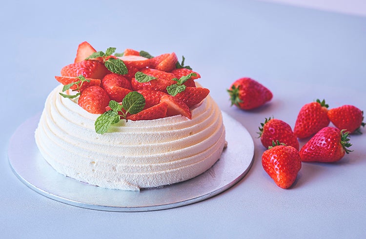 アーモンドフィナンシェの上にストロベリー、ライチ、ローズゼリーをのせ、爽やかなストロベリームースで包みました。贅沢にトッピングした京都産イチゴとともにお楽しみください