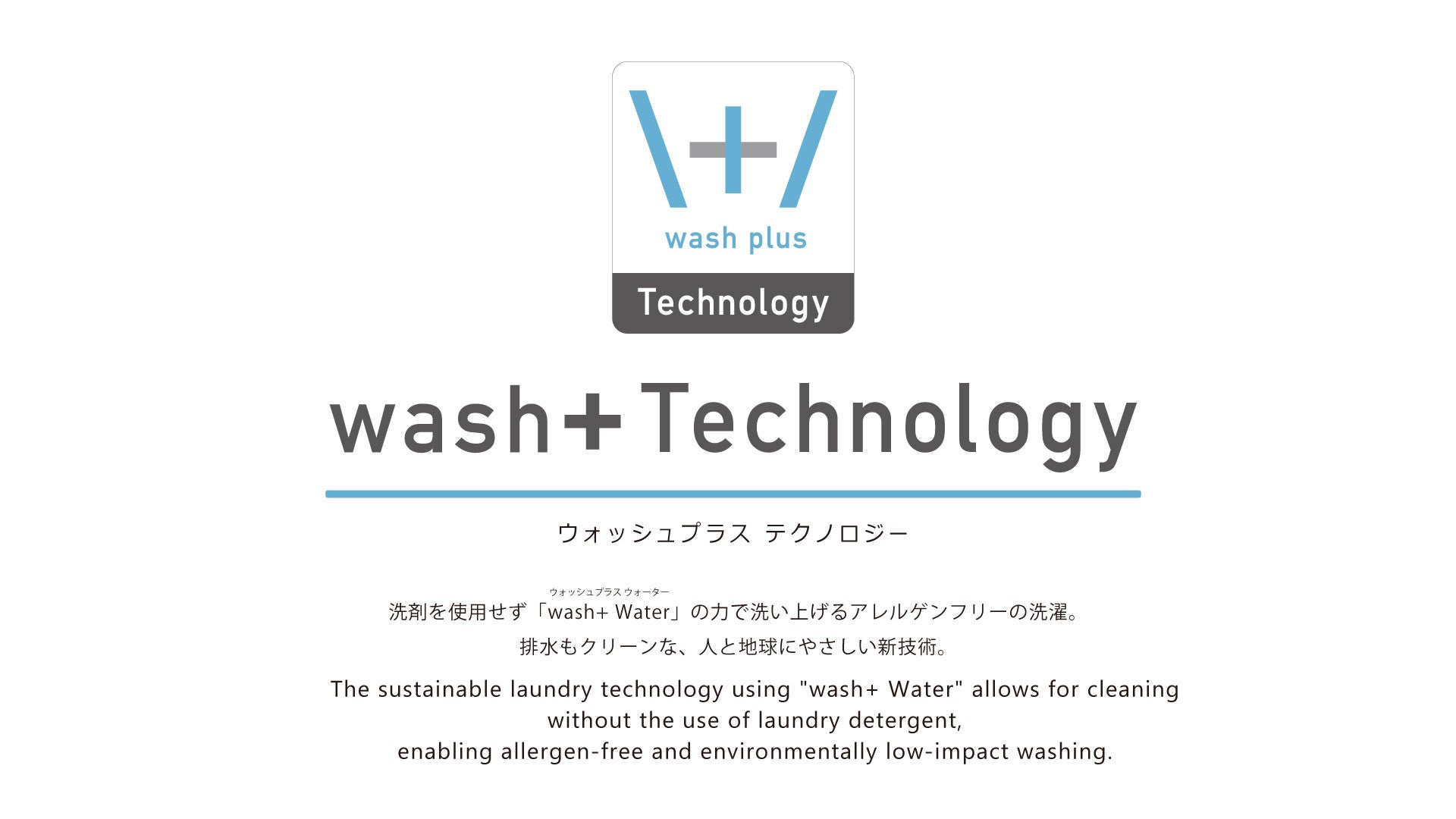 wash-plusは、洗濯専用に製造された無色・無臭のアルカリイオン電解水「wash+ Water(ウォッシュプラス ウォーター)」を使用し、洗剤ではなくイオンの力で洗濯する特許技術「wash+ Technology(ウォッシュプラス テクノロジー)」を持っています。敏感肌の方やアレルギー体質の方でも安心して利用できます。合成香料による化学物質過敏症の心配もありません。