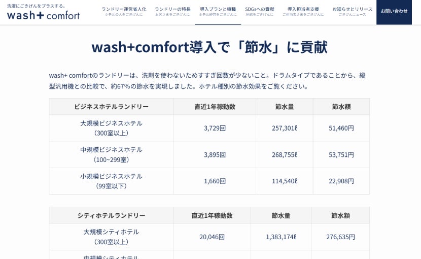 株式会社wash-plus(本社:千葉県浦安市、代表取締役:高梨健太郎)が展開する宿泊施設向けランドリー「wash+ Comfort」(ウォッシュプラス コンフォート)が、累積節水量とホテル種別節水量・稼働数モデルケースの情報について、掲載を開始しました。