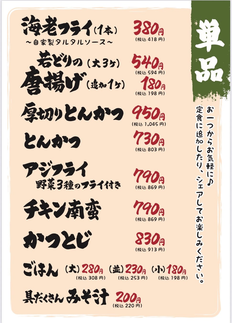 単品料理は、定食に追加したり、シェアしたりと、気軽にお楽しみいただけます。