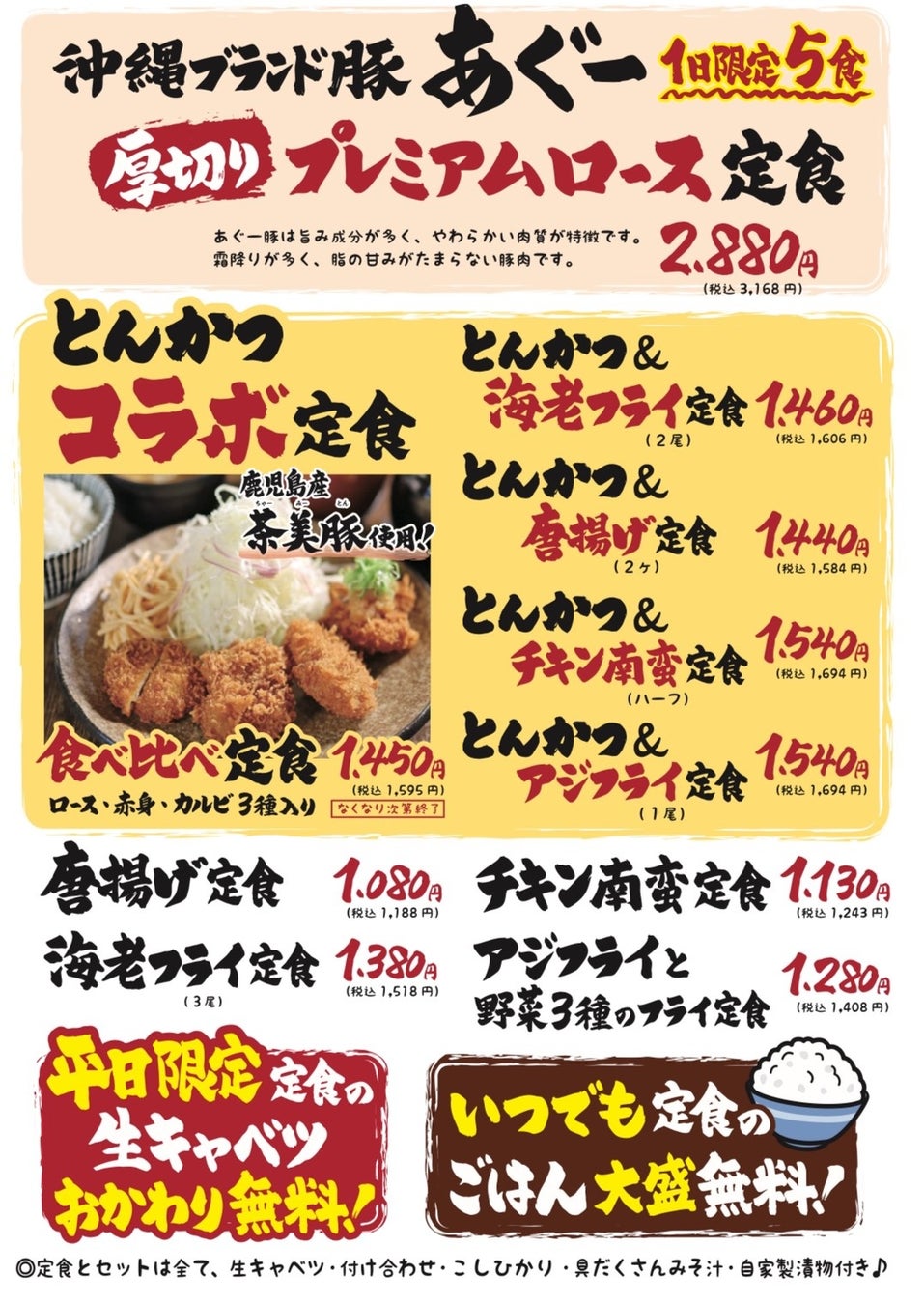 素材にこだわり抜いたとんかつをはじめ、海老フライ・唐揚げ・アジフライなどを、自家精米のごはんと共にお腹いっぱいお召し上がりいただけます。