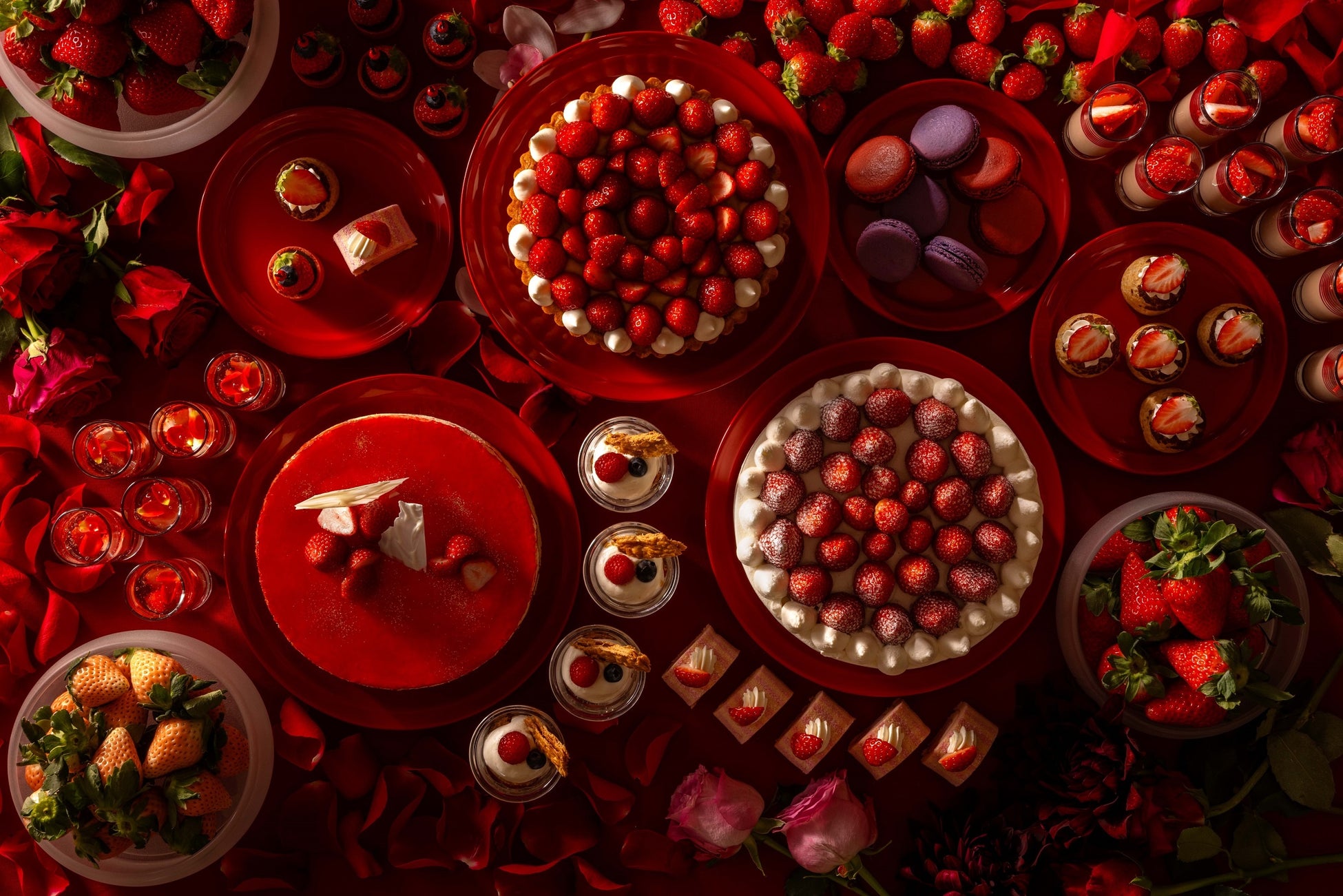 <スイーツ>ショートケーキ、フレジェ、ストロベリータルト、シュークリーム、ロールケーキ、ミルクレープ、ストロベリーティラミス、カップケーキ、割りチョコ、クッキー各種、ストロベリージュレとローズジュレ、グラスミルフィーユ、ミルクチョコのパンナコッタ