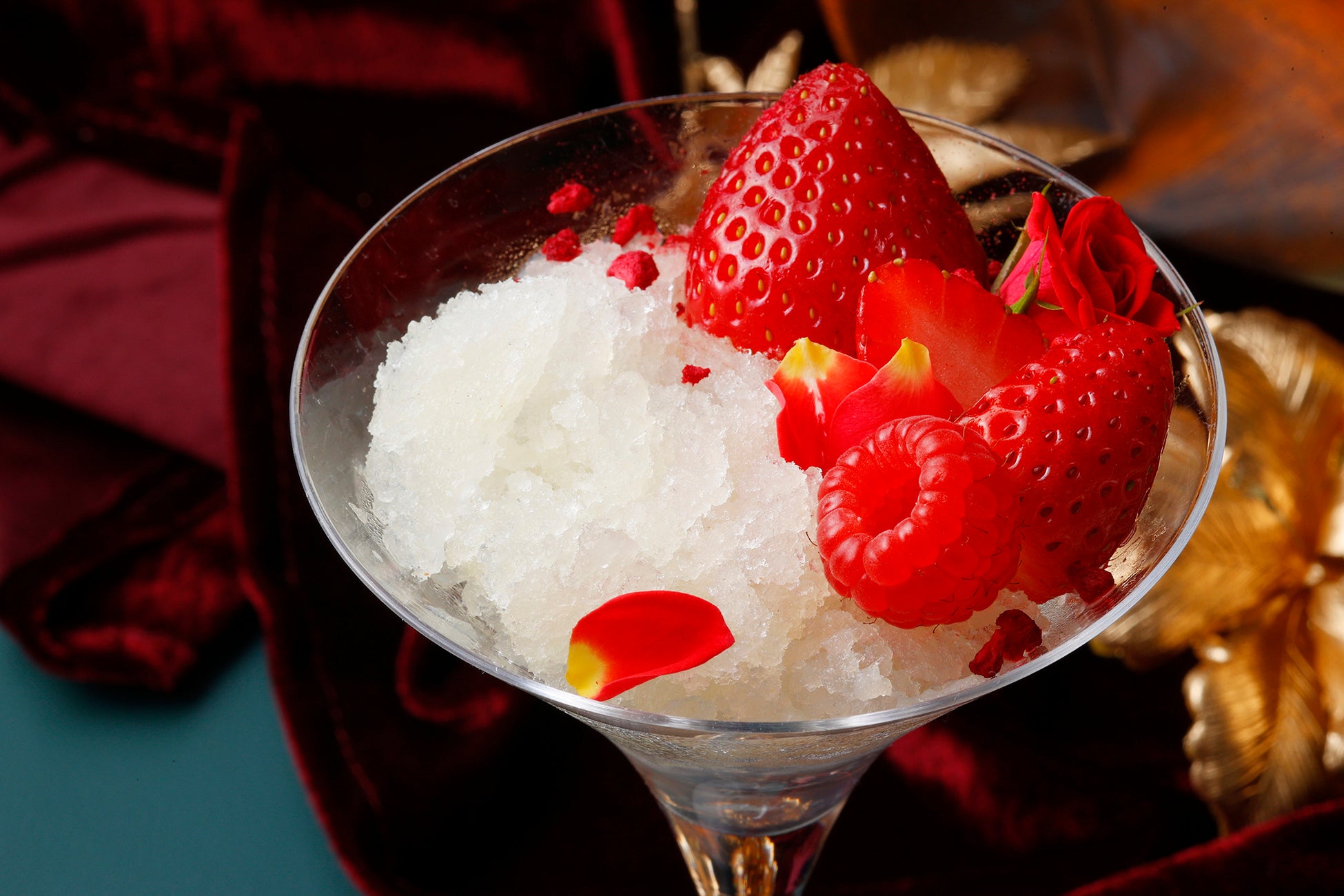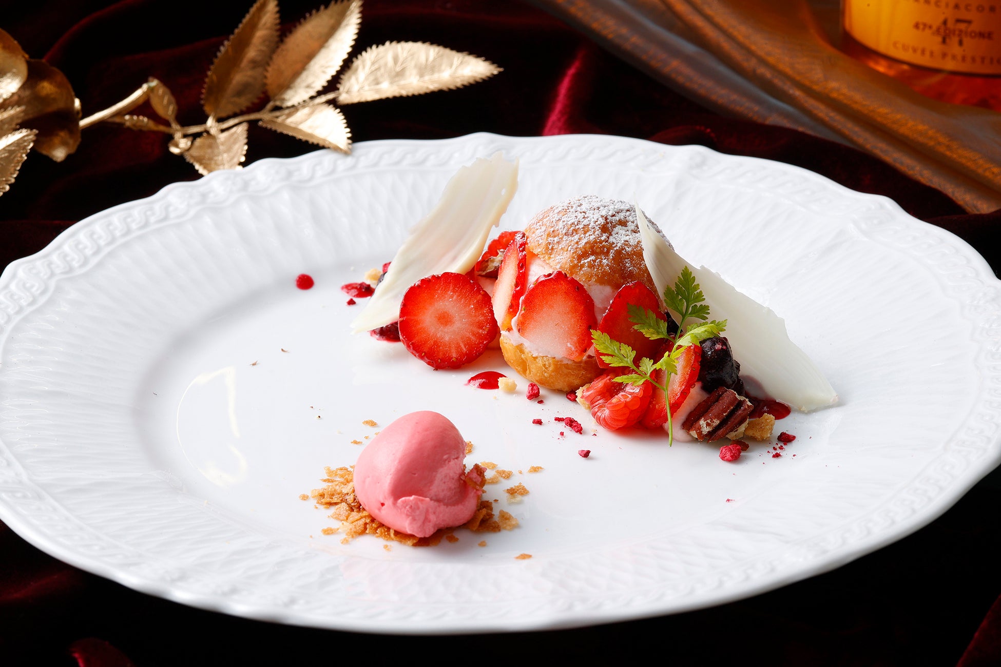 お口直しには「シャンパンのグラニテ」、デザートは「いちごのマリトッツォ」を愛らしい小さなサイズでご用意し、口どけの良い甘さが食後を軽やかに締めくくります。