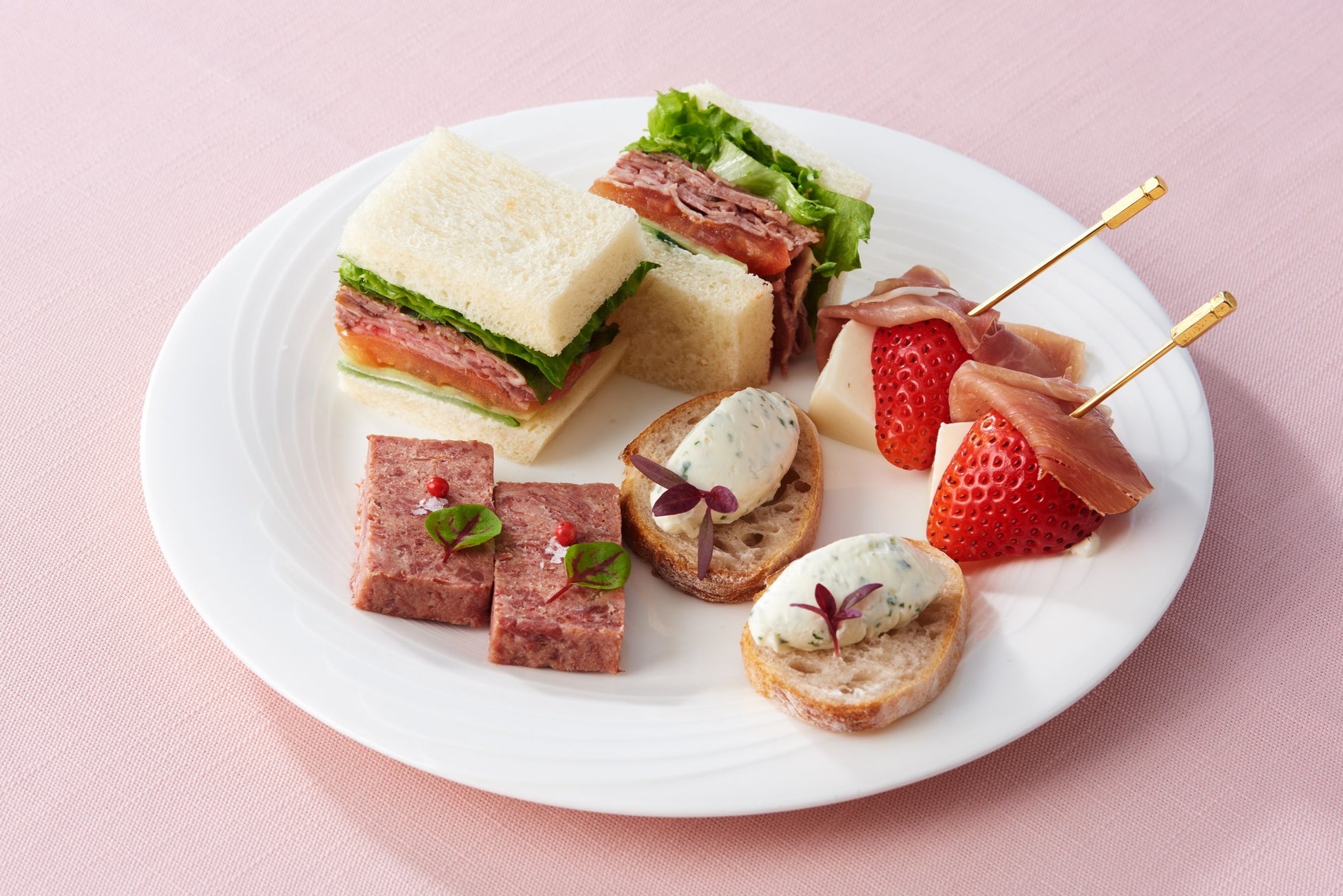 食べ応え抜群の「ローストビーフサンドウィッチ」を中心に、味の変化も愉しめるセイボリーをご用意。「いちご生ハムカプレーゼ」や「和牛コンビーフ」、香ばしい「ガーリックハーブのクリームチーズブルスケッタ」など、多彩なピンチョスはスイーツとの相性も抜群!甘味と塩味のバランスが、ティースタンド全体の満足感を引き上げます。