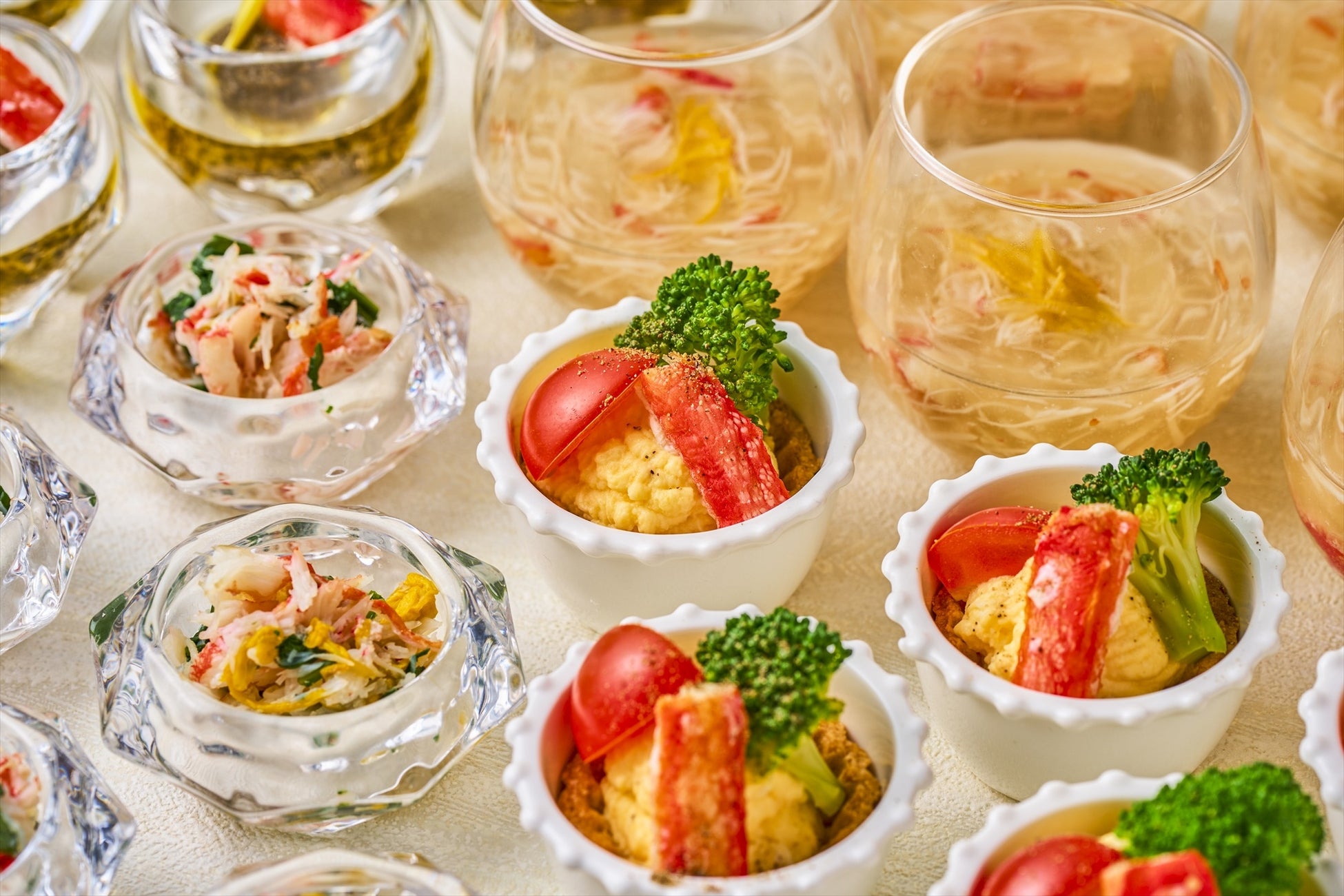 蟹を炙ることで香ばしさと旨味が増した一皿をじっくりとお召し上がりいただけます。また、蟹を使ったスモールポーションの一品一品は、美しい盛り付けで、お好みのものを豊富にお楽しみいただけます。さらに、ライブキッチンでは、料理長が試作を重ねて完成させた手作りの蟹クリームコロッケを提供いたします。カニの身とホワイトソースの絶妙なバランスが特徴です。