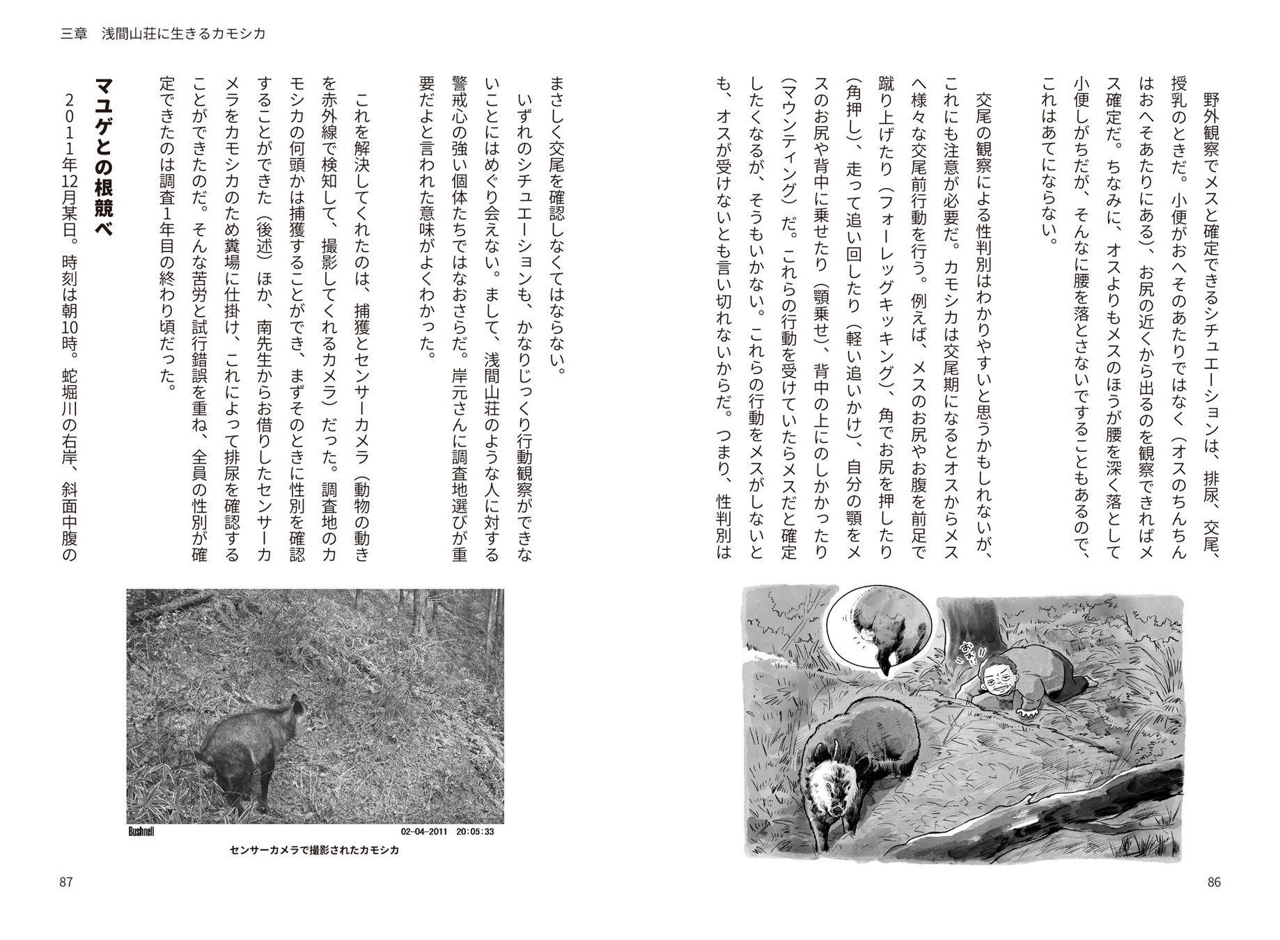 登山中にカモシカを見かけることは珍しくありませんが、じっくり観察する機会は多くありません。著者は個体を識別し、名前をつけ、長期にわたり行動を追い続けます。時に見つめ合い、時に危険を感じるほど近接しながら観察を続けることで、カモシカの意外な素顔や個体間に生まれる関係性のドラマが浮かび上がってきます。浅間山を舞台にした、迫力満点のカモシカ動物記としても楽しんでいただける内容です。