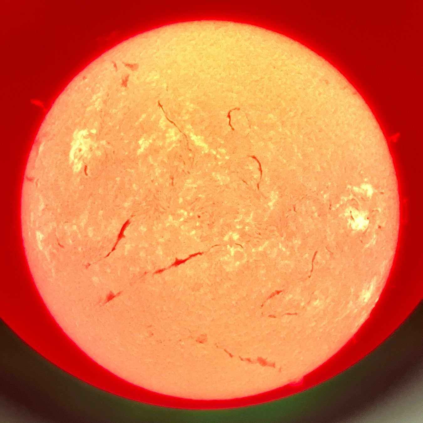 太陽の彩層面の物質が磁場のループにより持ち上げられた現象「プロミネンス」や、細流状の黒い筋のように見える「ダークフィラメント」などが見られます。