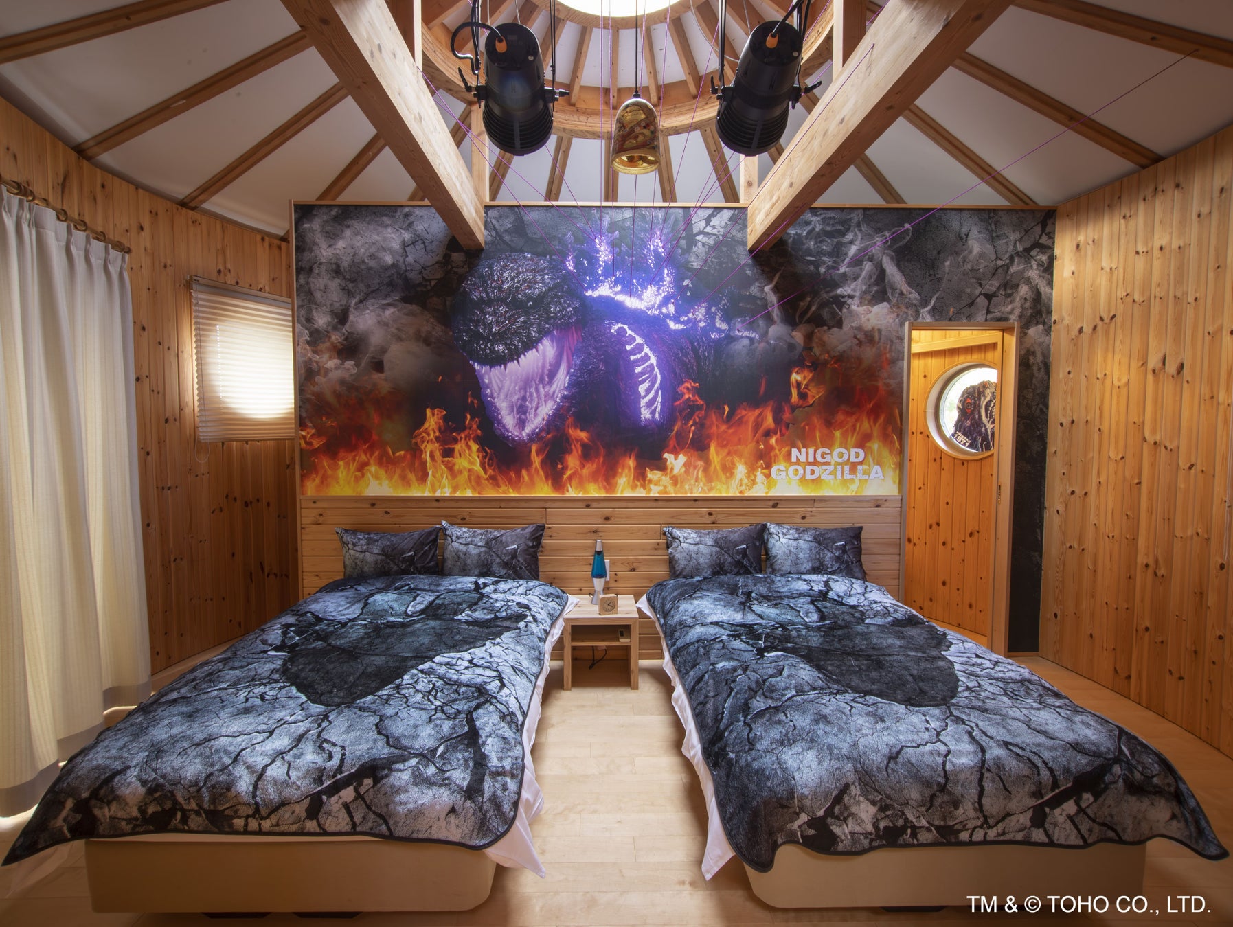 「ゴジラ」の70周年を記念し、歴代の「ゴジラ」映画作品に登場した怪獣たちが大集合したゴジラコラボルーム『怪獣ランド』。室内には、歴代ゴジラと人気怪獣たちが描かれたインテリアやタペストリー、窓越しに見える実寸大ゴジラの一部、さらに、それらに光の照射で見え方が変わる特殊加工を施すことによって、昼・夜で異なった室内の雰囲気をお楽しみいただけます。室内に隠れた全ての怪獣たちを見つけ出すことで豪華特典が手に入る“特別任務”に挑戦していただくなど、昼夜通してお愉しみいただけるお部屋です。