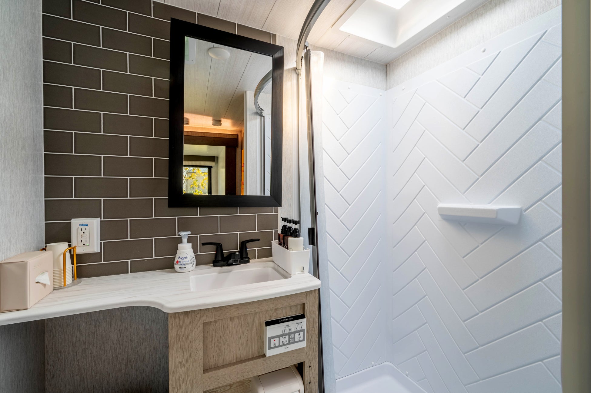 室内にはエアコンやWi-Fi、冷蔵庫、電子レンジ、キッチン、食事スペース、洗面台、トイレ、シャワーブースまで完備。まるで自宅のような快適さと、リゾートならではの特別感を両立した空間で、自然に囲まれながら安心してお過ごしいただけます。