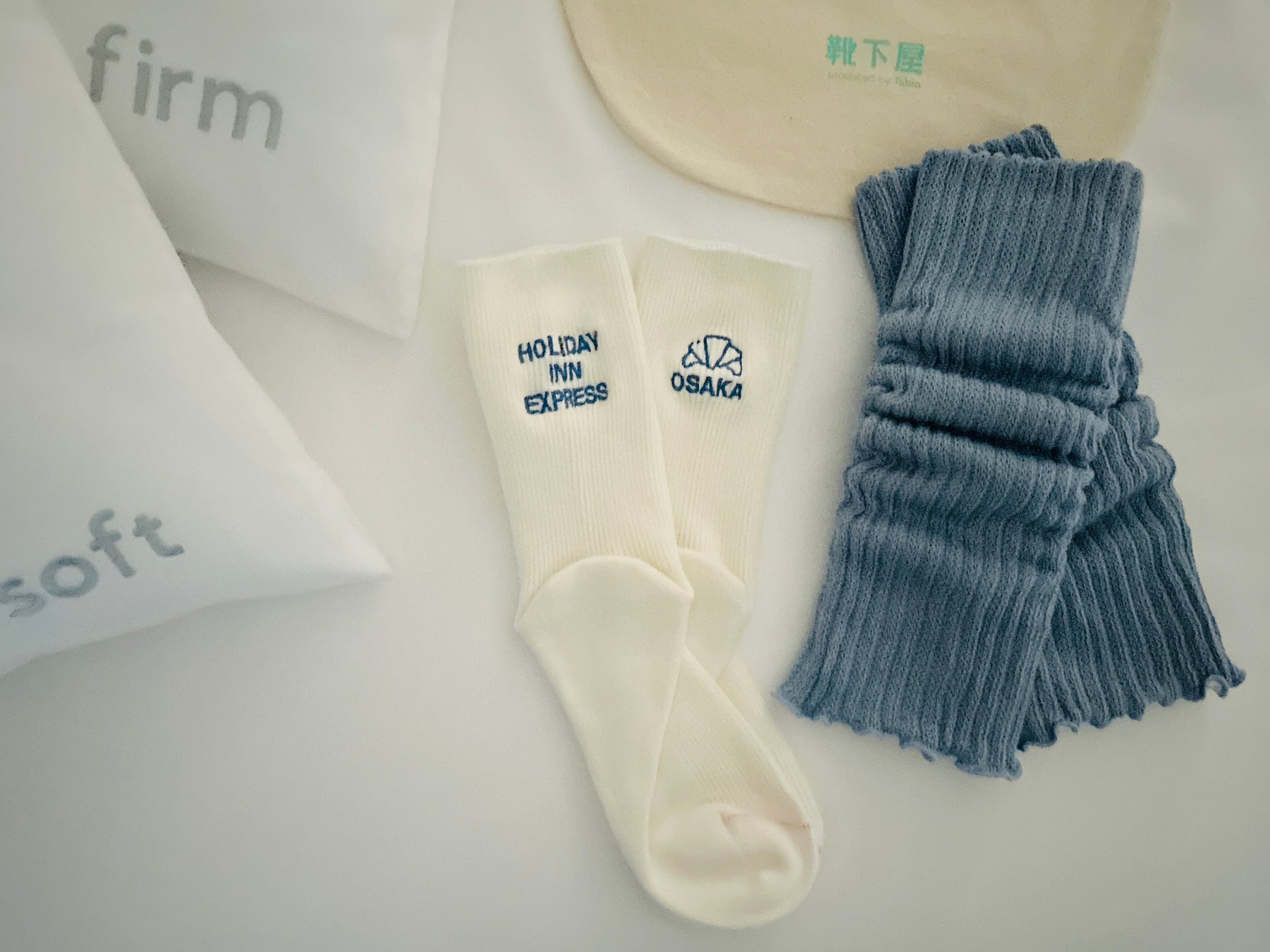 「開業4周年アニバーサリープラン」には、大阪に本社を置く、メイドインジャパンのモノづくりに定評のある靴下メーカー「Tabio(タビオ)靴下屋」による当ホテル別注のオリジナル刺繍が入った靴下とレッグウォーマーのセットをアメニティとしてご用意します。靴下には片足ずつオリジナル刺繍が施され、片方にはホリデイ・イン エクスプレスの特徴の一つである和・洋の朝食をブッフェスタイルにて毎日無料で提供する「Prime Morning」を表現した「クロワッサン」の刺繍。もう片方には、ホテル名の刺繍が入った、足のラインを綺麗に見せるリブソックスをプレゼントします。加えて、寒い冬の旅で疲れた足を温める、コットンシルク製の二重アメリブレッグウォーマーもセットにしました。より快適な部屋での寛ぎ時間を楽しめる、この冬の嬉しいアイテム二点をセットにしてお渡しします。