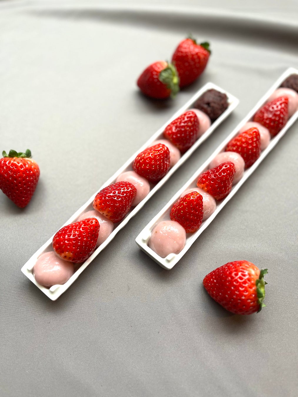 いちごを練り込んでピンク色に仕上げた白玉は、茹でたてあつあつでご提供。いちごと白玉がずらっと並んだ姿が特徴です。小麦、乳製品アレルギーの方にも安心してお召し上がりいただけます。