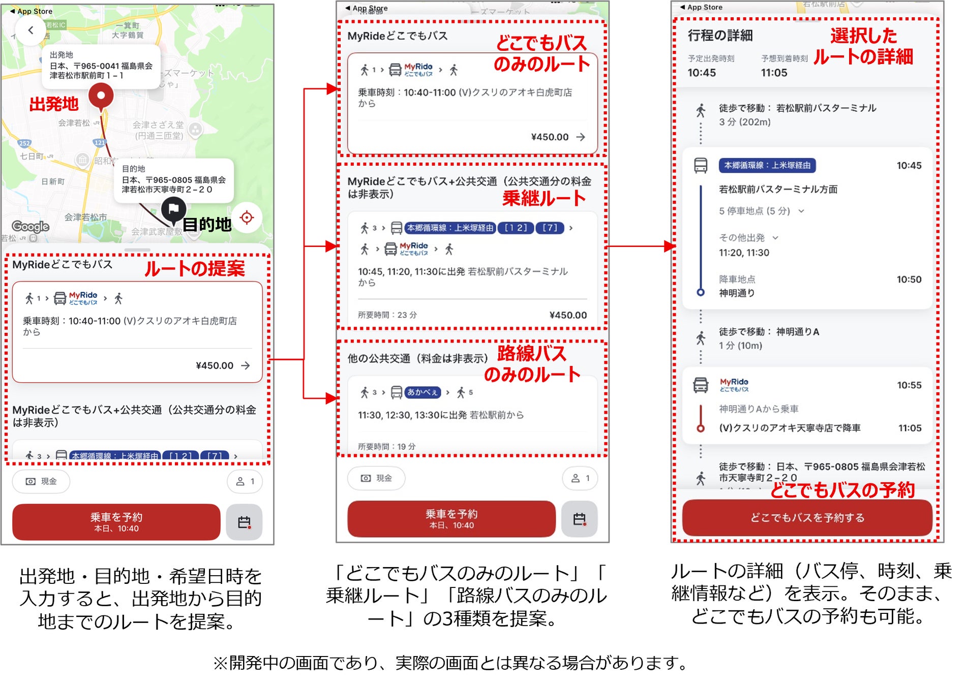 会津乗合自動車株式会社(福島県会津若松市、代表取締役社長:佐藤俊材)、株式会社みちのりホールディングス(東京都千代田区、代表取締役グループCEO:吉田元)は、2025年12月15日から、「MyRideどこでもバス(以下、どこでもバス)」のアプリに、AIオンデマンドバスと路線バスとの連携ルート検索・乗継提案およびAIオンデマンドバスの予約を一体化した新機能「えらべるナビ」を実装します。
