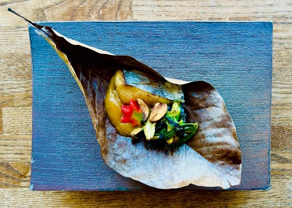 別府湾で水揚げされる鰆は、冬に向けて旨味をたたえる季節の魚。その身を朴葉の香りとともにふんわりと焼き上げ、季節のキノコを添えて仕立てたのが「鰆の朴葉焼き」です。合わせる味噌は、雪月花が丁寧に仕上げた特製のもの。まろやかな風合いが鰆のよさをやさしく引き立てます。朴葉から立ちのぼる香りとともに、冬の会席らしい落ち着いたひと皿としてお楽しみいただけます。