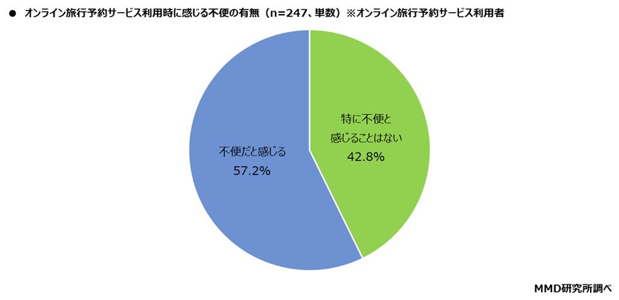 オンライン旅行予約サービス利用者247人を対象に、オンライン旅行予約サービス利用時に不便だと感じるかどうかを聞いたところ、「不便だと感じる」が57.2%、「特に不便と感じることはない」が42.8%となった。