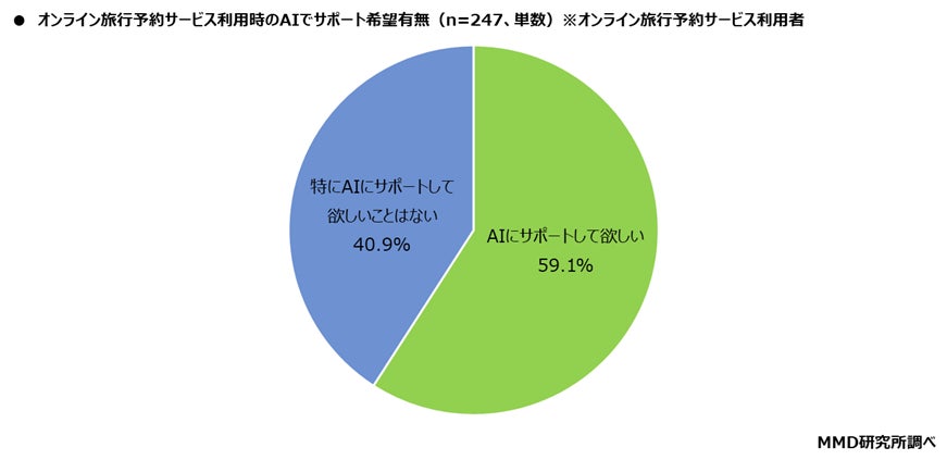 オンライン旅行予約サービス利用者247人を対象に、オンライン旅行予約サービス利用時にAIでサポートして欲しいか聞いたところ、「AIにサポートして欲しい」が59.1%、「特にAIにサポートして欲しいことはない」が40.9%となった。