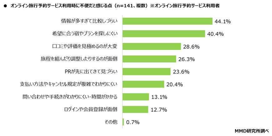 次に、オンライン旅行予約サービス利用時に不便だと感じると回答した141人を対象に、不便だと感じる点を聞いたところ(複数回答可)、「情報が多すぎて比較しづらい」が44.1%と最も多く、次に「希望に合う宿やプランを探しにくい」が40.4%、「口コミや評価を見極めるのが大変」が28.6%となった。